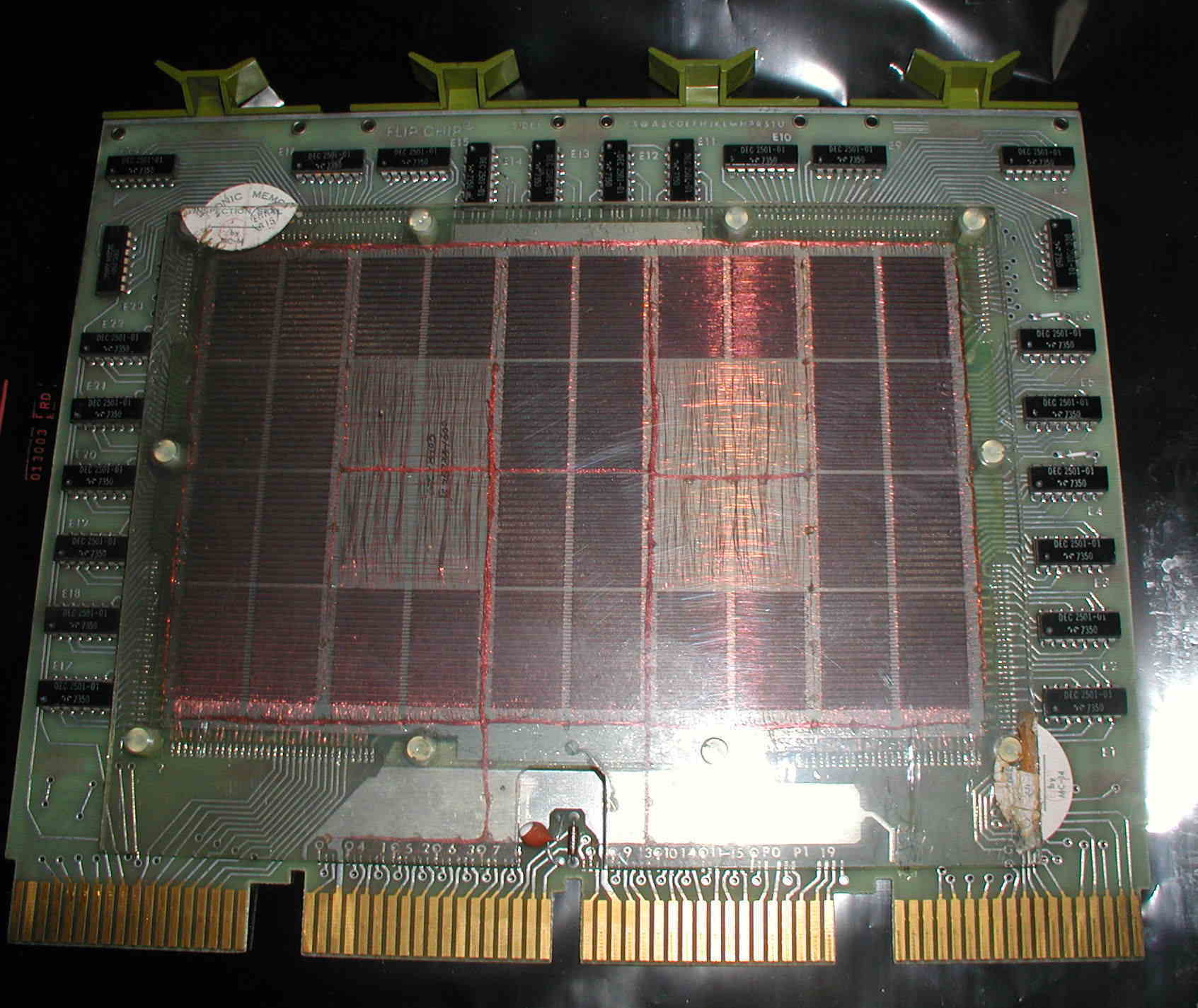 これがコアメモリ。黒い部分がコア(フェライトビーズ)でここに記憶する。