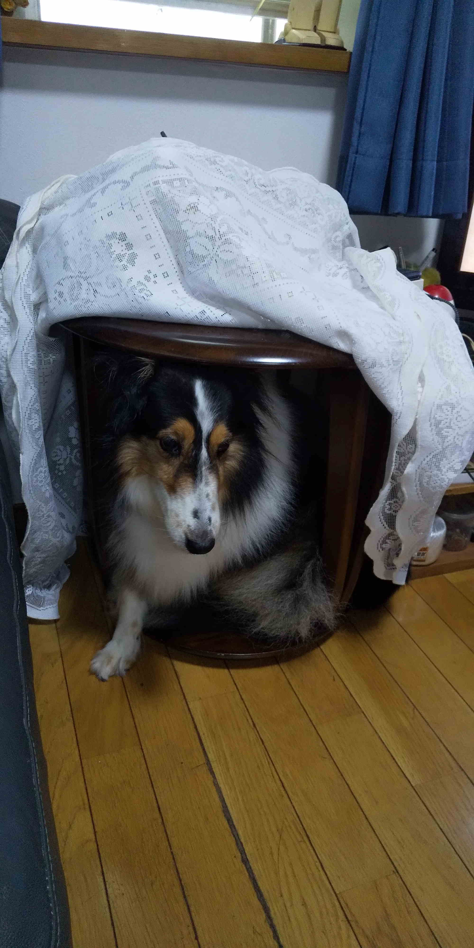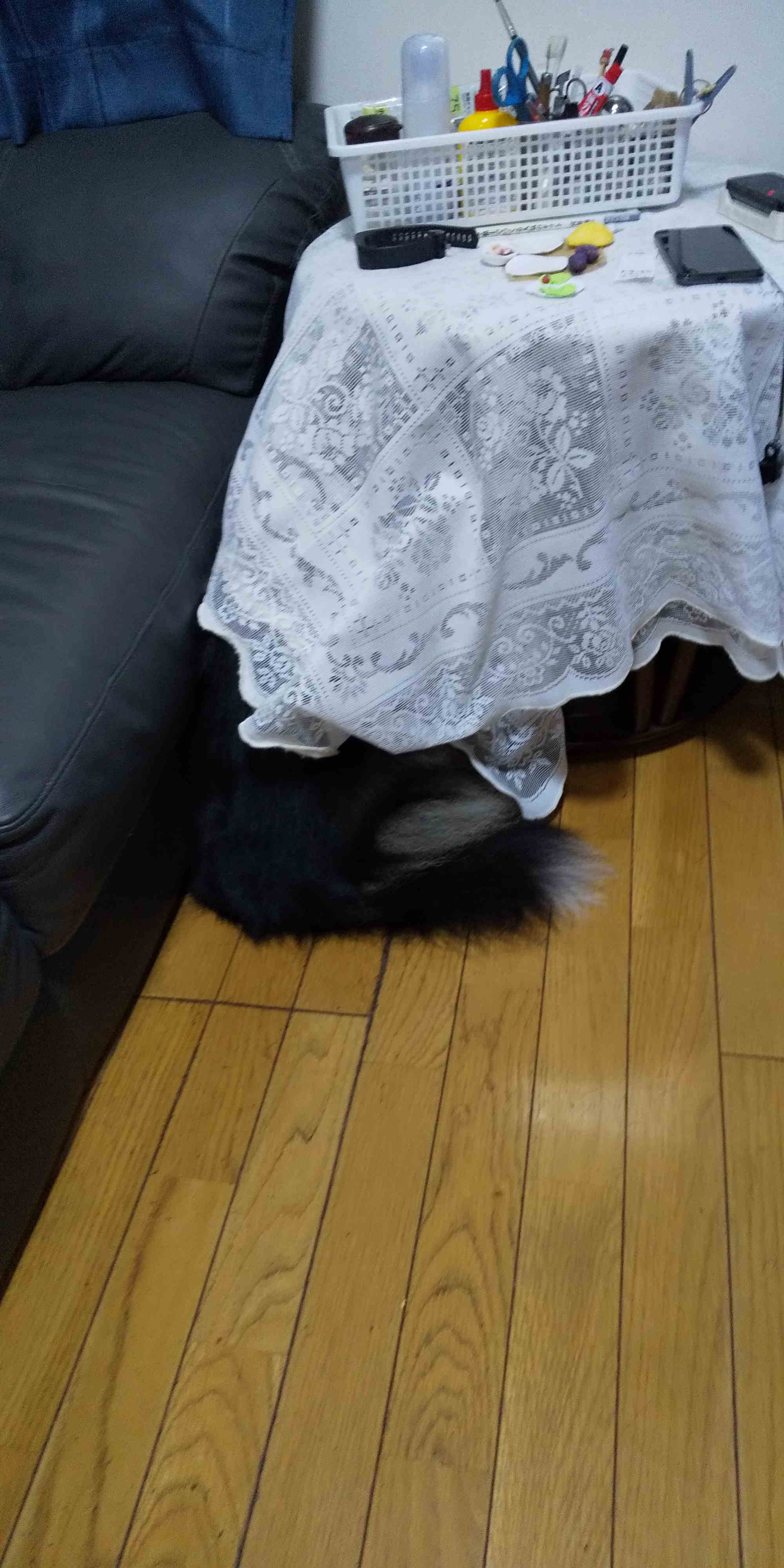 ソファーのそばのテーブルです。レースの掛物で下に入れるのが今まで分からなかったのでしょう。今日たまたま頭を近づけたら中に入れることが分かって頭を隠したままじっとしています。
