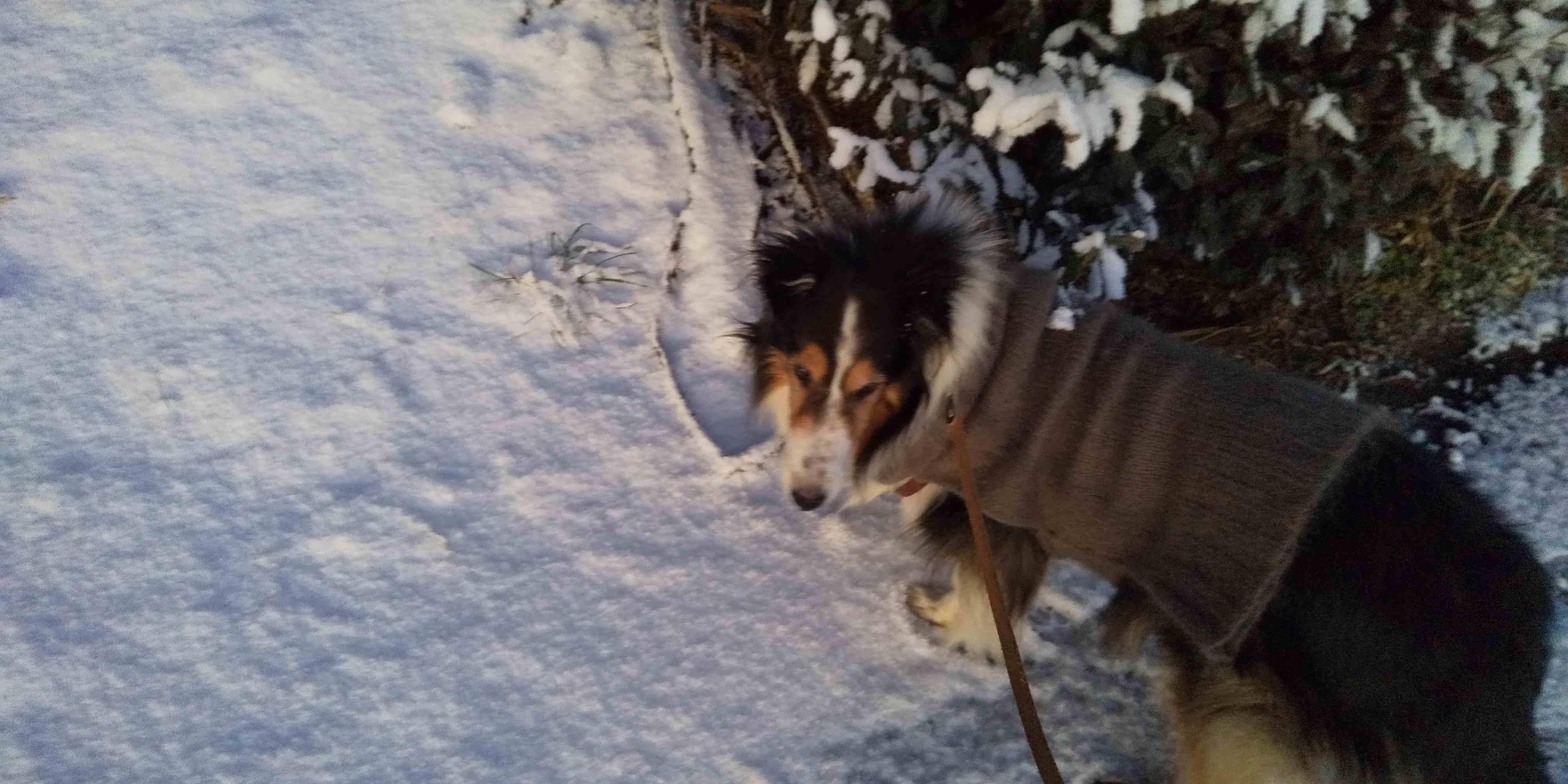 しばらく寒い日が続いたが、今日はどういうわけか、寒くない。ジョリーはコートなしで朝のお散歩です。
