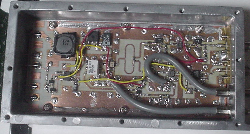・ケースへ組み込んだ時に電源まわりを正規の配線にしようとして間違いに気づいた。GALI−84を12V動作にしたので、送受切り替え信号で12Vを切り替え無ければならない。もともと5Vで切り替えるつもりだったので、これを12Vに変更した。このためGALI−84をドライブするGALI−39も12V駆動としなければならない。5Vだとバイアス抵抗が50Ωでちょうど良かったが、12Vだと220Ωとなる。手持ちのチップ抵抗になかったので270Ωを付けてみた。