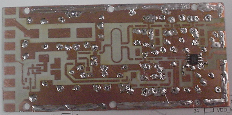 ・穴をあけて、なんちゃってスルーホールを付けて、部品を2,3載せたところで写真を