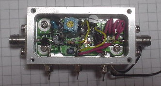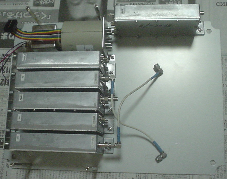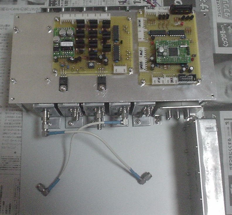 ・各バンドのアンプが出来た。以前オクで入手していたアンプケースを流用した(10GHzトランスバータ参照)。このケースは出力モニタ用DC出力が付いていたので、急遽、CPUの設計変更でDC出力をモニタできるようにした。予備のコネクタを1個付けていたのでこれを使用する。これで予備が無くなったので、次に改造するには無理矢理コネクタを付けなければならない。って言うかもう改造できない。えっ、コネクタなくても・・・。自分のポリシーとして組み立てた後、ハンダ鏝が無いと分解できないのはダメと決めている。片側はコネクタにして、分離出来るようにしている。