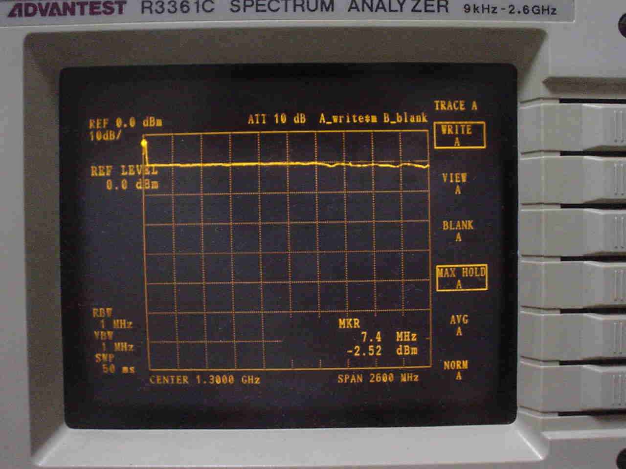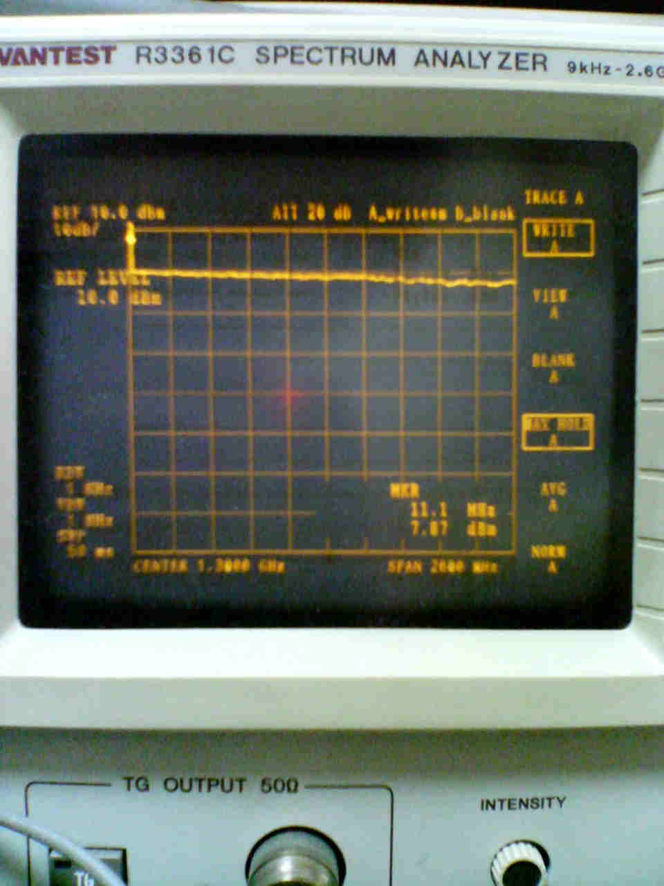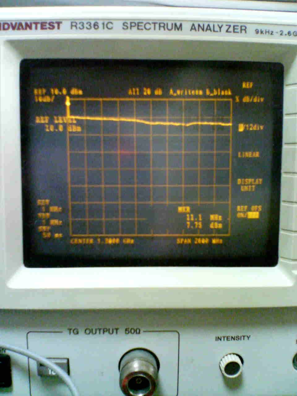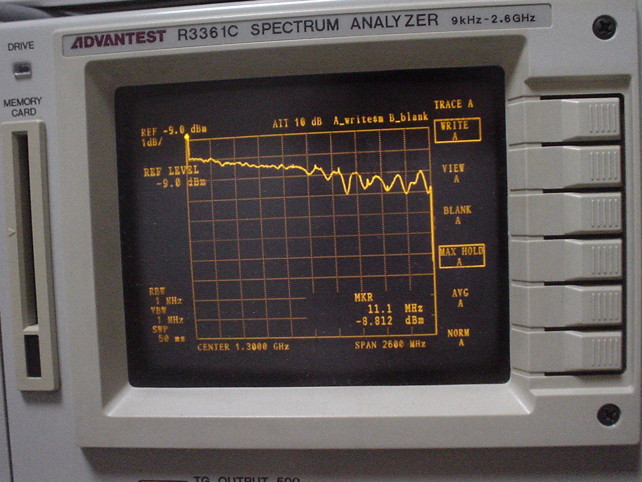 ・修理が完了したので、R3361Cでレベルを観測してみた。MAXホールドでMG3633Aの出力をスイープすると以下のような