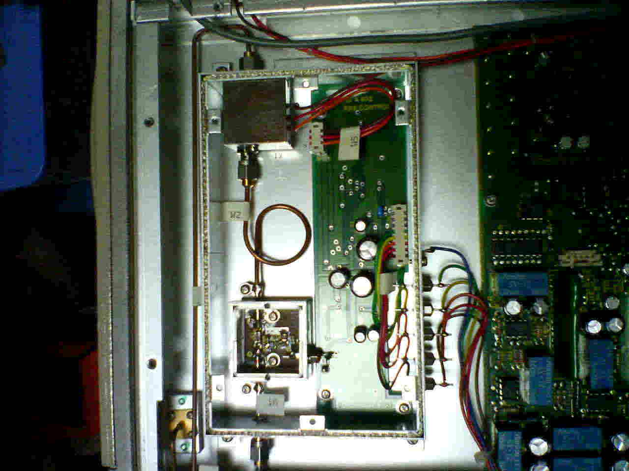この写真では、下側がアンプで上から出た信号はセミリジッドケーブルで出力コネクタへ行っている。この間が不良である