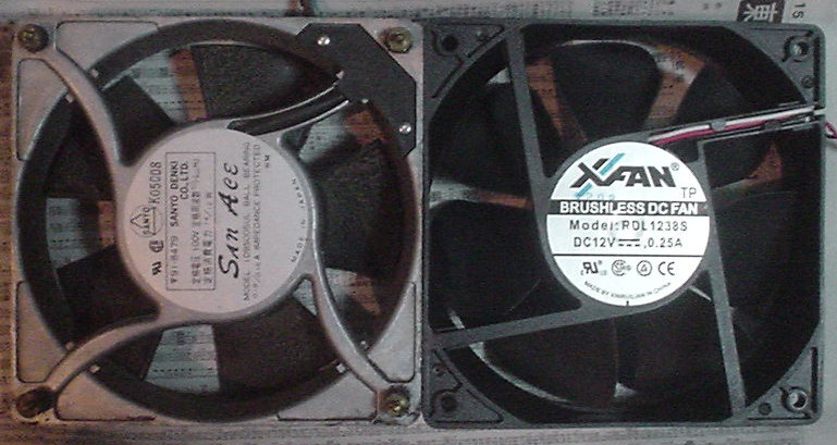 ・FANが届いたので早速交換だ。左が元付いていたもの、右が新しいFANである。当然FAN用の電源も追加する。