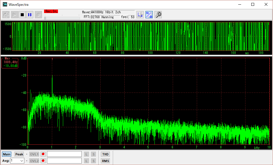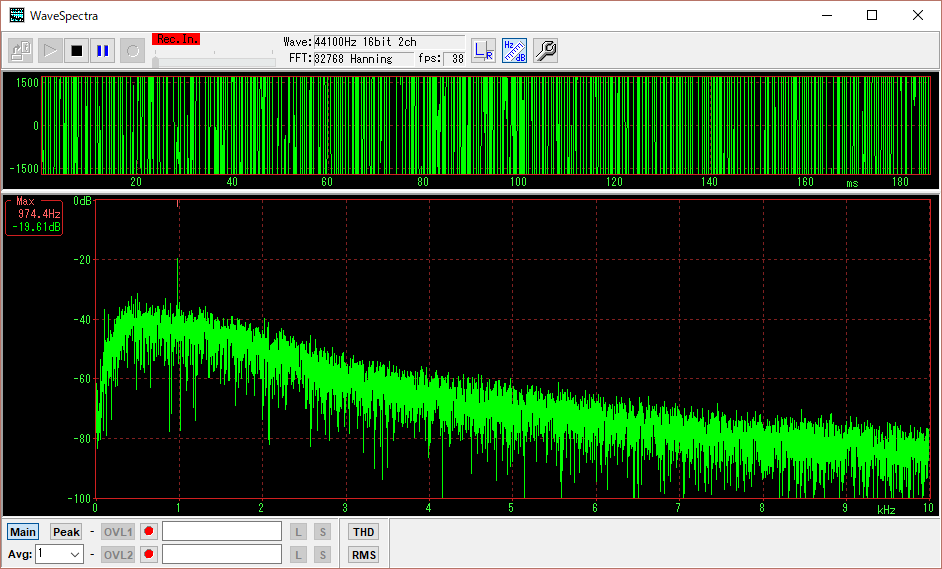 しばらくワッチしてみた。ちょっとノイズっぽい、IFの入力を入れなくても出るので、IFで発生しているようだ、上のオーディオスペアナのように3SK35の時よりはよくなっているが、気にするせいか、ノイズが気になる。オーディオ出力にCRのローパスフィルタを入れてみた。結果そこそこましになった。