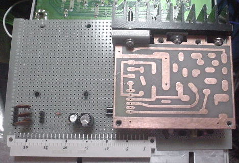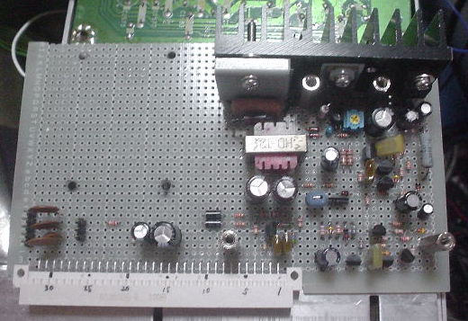 ユニバーサル基板だが、高圧用発振回路とレギュレータ回路である。設計が古いのでICではなくトランジスタで組んである。(ジャンクになるような古い物だからしょうがない)。